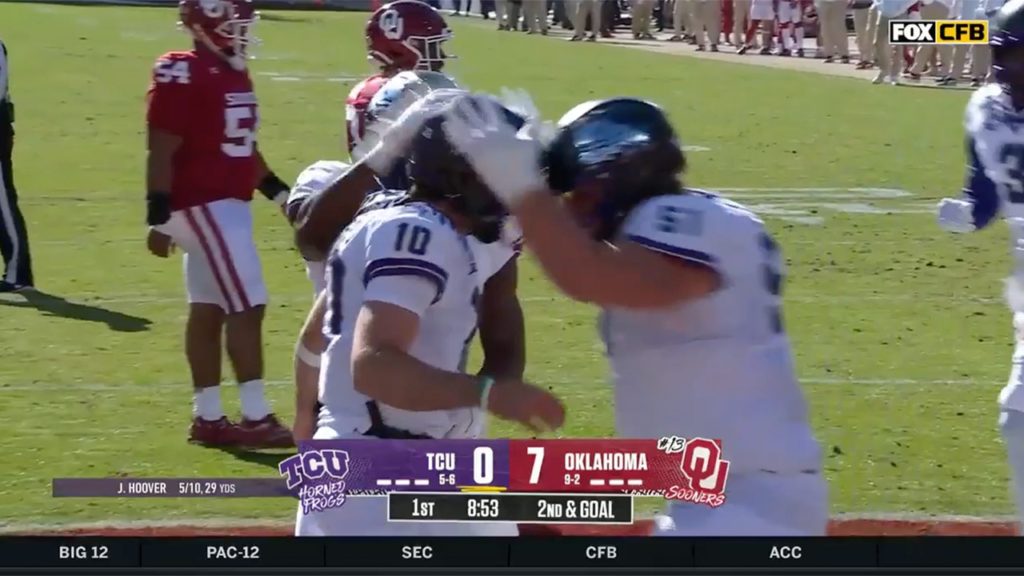 After a muffed punt by Oklahoma, TCU's Josh Hoover keeps it and takes it three yards for a TD