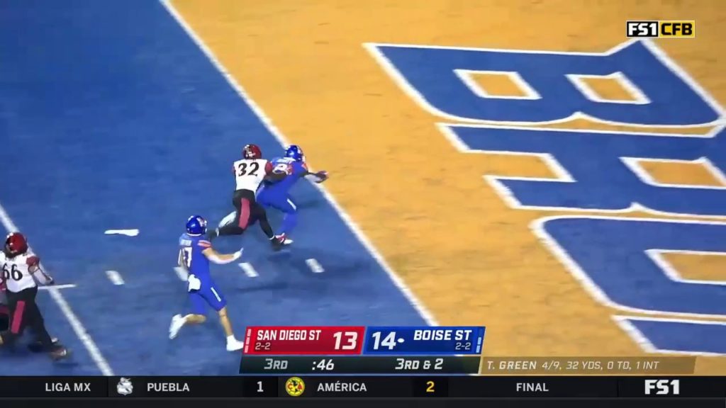 Boise State Broncos’ RB George Holani’s 12-yard rushing TD gives the Broncos a 14-13 lead against the San Diego State Aztecs in the third quarter.